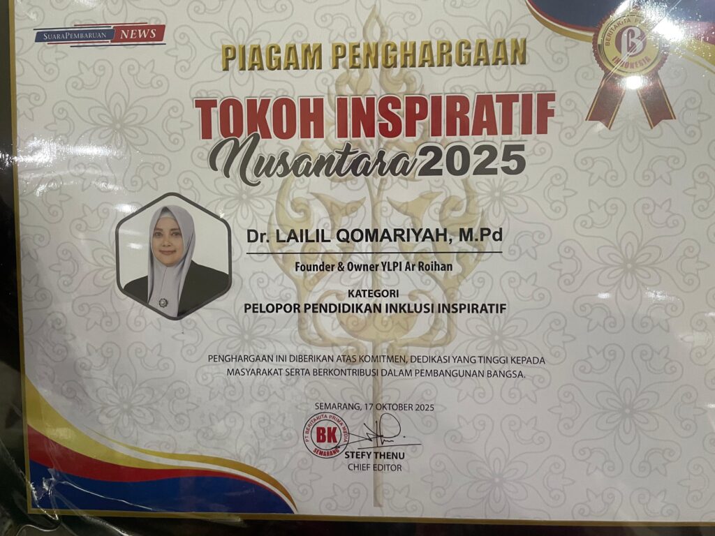 Atas komitmennya terhadap pendidikan madrasah berbasis inovasi dan religiusitas, Kepala MIT Ar Roihan, Dr. Lailil Qomariyah, M.Pd. menerima penghargaan sebagai Tokoh Inspiratif Nusantara Tahun 2025. Beliau bersama 18 tokoh lain dari berbagai daerah di Indonesia menerima penghargaan dari BeritaKita Publisher yang bekerja sama dengan Suara Pembaruan News. Pada malam penganugerahan yang dihelat di Wisma Perdamaian, Semarang, Jumat (17/10/2025) malam, beliau hadir bersama dengan Ketua YLPI Ar Roihan, Farid Afandi.